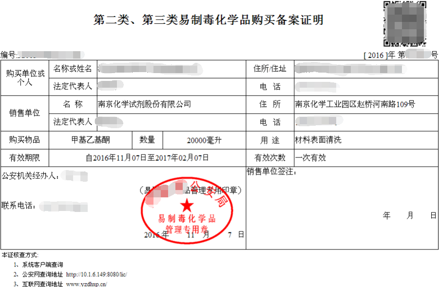 1.易制毒化學品購買備案證明 | 銷售方需提供: 1.營業執照; 2.非藥品類易制毒化學品生產備案證明; 3.危險化學品經營許可證; 4.安全生產許可證; 5.銷售合同; 采購方需提供: 1.易制毒化學品購買申請表; 2.營業執照(尚未三證合一的提供營業執照、組織機構代碼證、稅務登記證); 3.經辦人及法人信息; | 《易制毒化學品購買備案證明》由購買方到當地公安局或者網絡平臺自行辦理。所需銷售方提供的資料向銷售業務員索取。 |