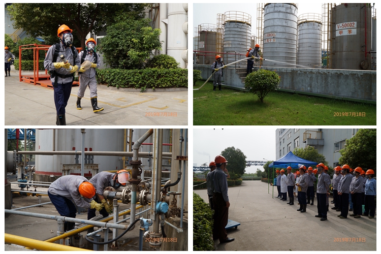 7月18日下午,公司組織了安全、消防、環保綜合預案演練。15時許,原料罐區模擬“甲苯儲罐底閥連接軟管斷裂發生泄漏”,接生產分廠和門衛總值班報告后,應急救援領導小組總指揮宣布啟動應急預案。各應急救援小組接到通知后,緊急趕赴事故現場。警戒疏散組現場進行了隔離疏散;后勤保障組及時將搶險物資送至現場;醫療救護組對“中毒人員”進行救治并送往醫院;應急搶修組對泄露的“甲苯”進行吸附、空氣稀釋、回收等應急處理,并對斷裂軟管展開搶修;污染控制組關閉公司對外雨污排總閥,開啟事故池閥門,及時封堵現場雨水口,并對現場泄漏物進行檢測監控。至15時45分許,總指揮宣布解除警戒,演練結束。