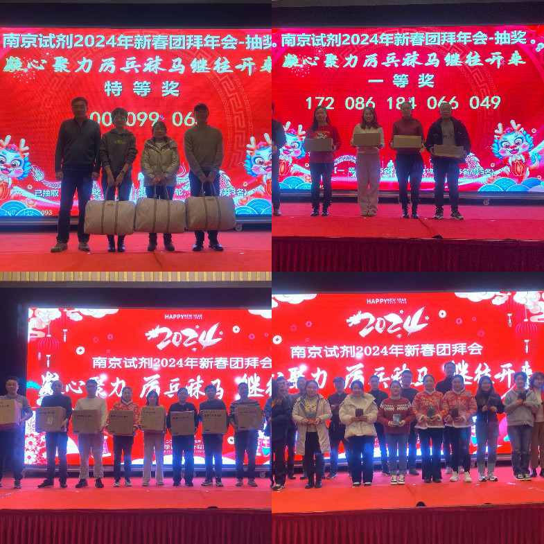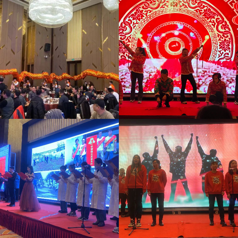 各部門、分廠獻上了自編自導自演的文藝節目。首先登場的是傳統民間藝術《舞龍》,伴隨著“長龍”的飛舞穿梭,宴會氣氛頓顯活躍,員工們迅速從緊張的工作狀態中釋放出來。緊接著,串燒(科目三+開門紅)、合唱《如愿》、表演《敬業陣線聯盟》、舞蹈《茉莉花》、合唱《真心英雄》……一曲曲動人的旋律,一部部深情的演繹,一張張陶醉的笑臉,抒發著對未來生活的憧憬與希望。由“藍精靈”讀書會編導,24位節氣姑娘、小伙們聯合呈現的詩朗誦《南試情》,用“濃情歲月”、“激情寫照”、“豪情展望”三個篇章,深情回顧了南京試劑建廠66年,一代代南試人艱苦創業,拼搏進取的艱辛歷程,展望了企業聚焦精細化學品,把試劑品種做多、把藥用輔料做專、把定制產品做優、把企業管理做精,為顧客提供優質產品和服務的美好藍圖。倡導新時期南試人記住來時路,看清前方路,走好當下路,銘懷初心,牢記使命,自我賦能,勇敢擔當,為企業發展貢獻力量。