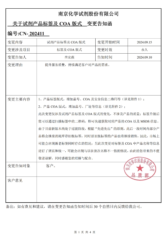 南京化學(xué)試劑股份有限公司擬定-自2024.09.15對(duì)于[試劑產(chǎn)品標(biāo)簽及COA版式]進(jìn)行變更,詳情如下:
