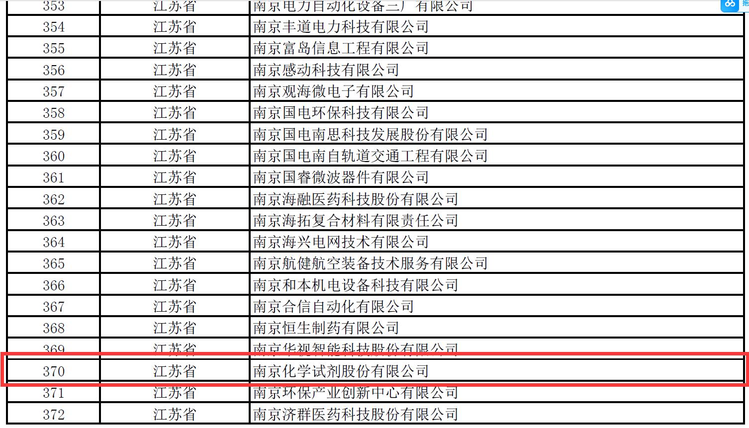 近日,江蘇省工業和信息化廳發布了《關于江蘇省第六批專精特新“小巨人”企業和第三批專精特新“小巨人”復核通過企業名單的公示》,南京試劑已通過審核,入選第六批國家級專精特新“小巨人”企業。
