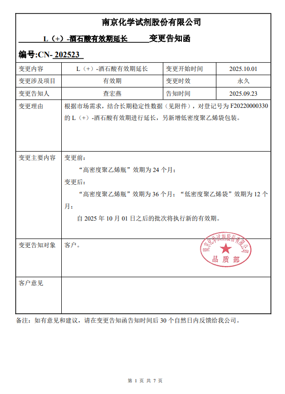 首頁 > 新聞中心 > 企業(yè)公告 L(+)-酒石酸有效期延長變更告知函