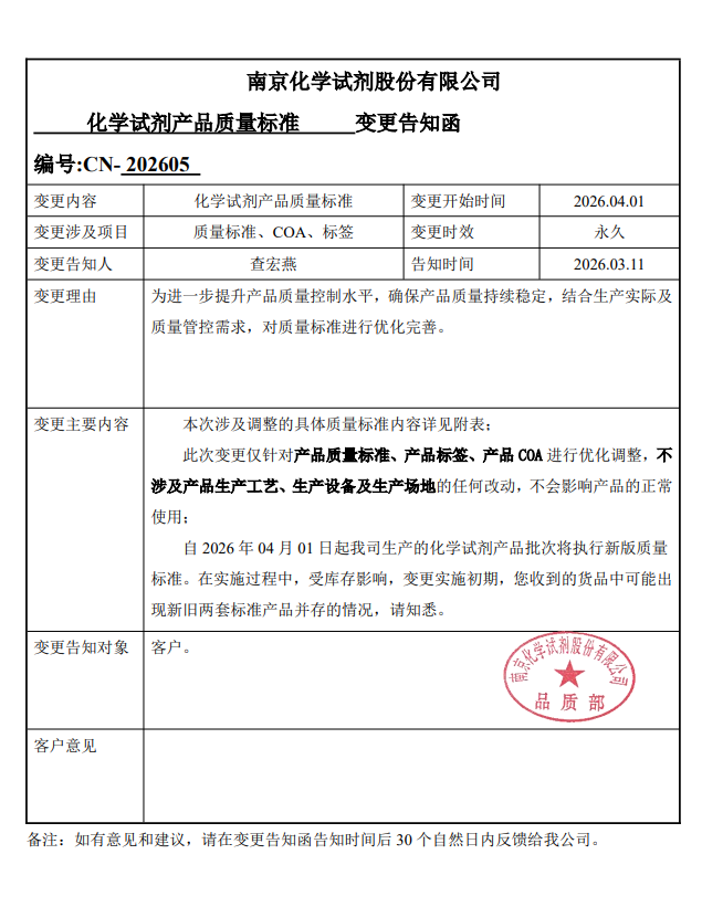 自 2026 年 04 月 01 日起我司生產的化學試劑產品批次將執行新版質量標準。在實施過程中,受庫存影響,變更實施初期,您收到的貨品中可能出現新舊兩套標準產品并存的情況,請知悉。