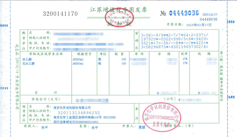1.南京化學(xué)試劑股份有限公司發(fā)票一般以三種形式進(jìn)行投遞:郵局掛號(hào)信,快遞及隨貨同行。